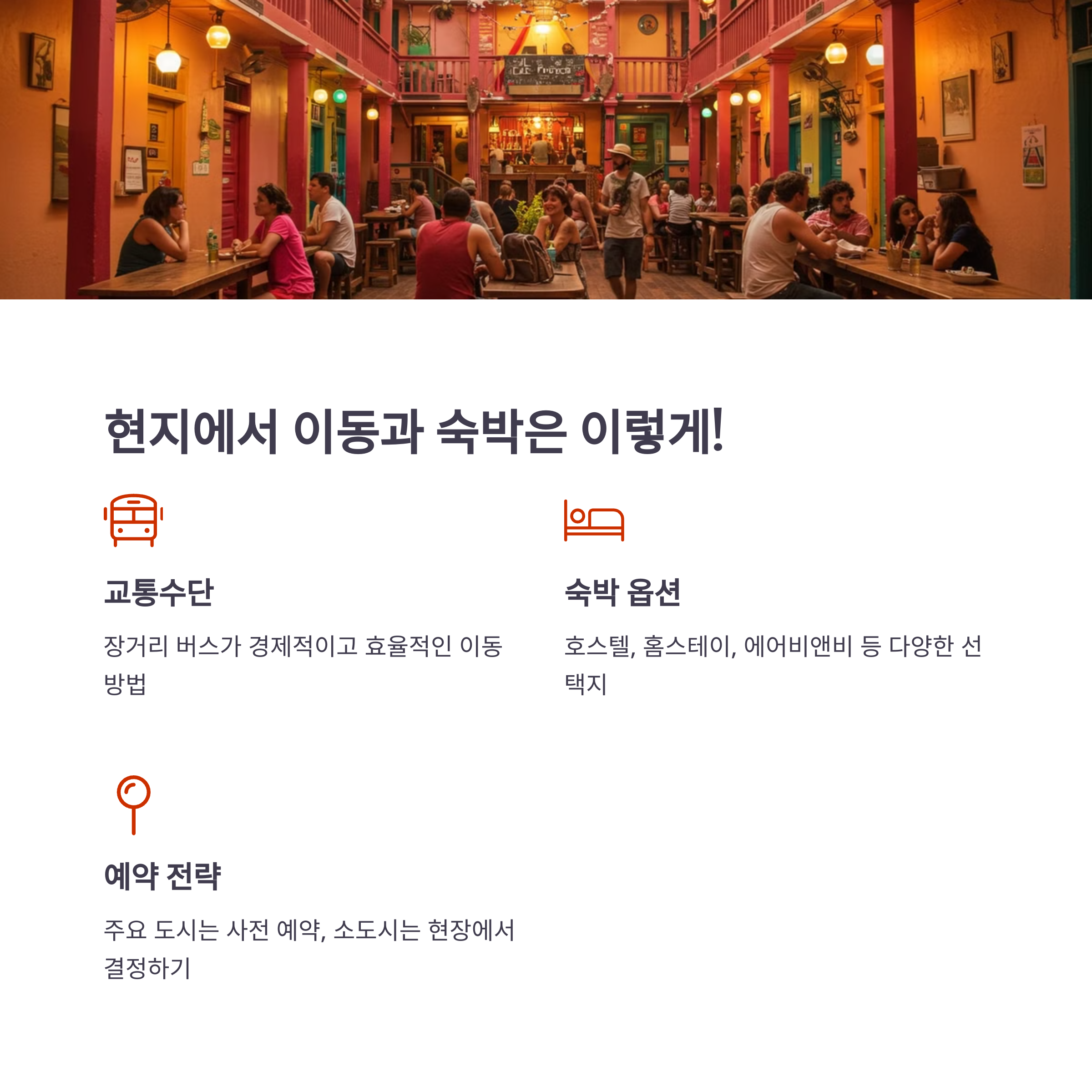 남미에서는 장거리 버스가 가장 일반적인 교통수단이에요. 특히 레클리닝 시트가 있는 1등석 버스는 편안하게 야간 이동이 가능해서 숙박비도 절약할 수 있죠.