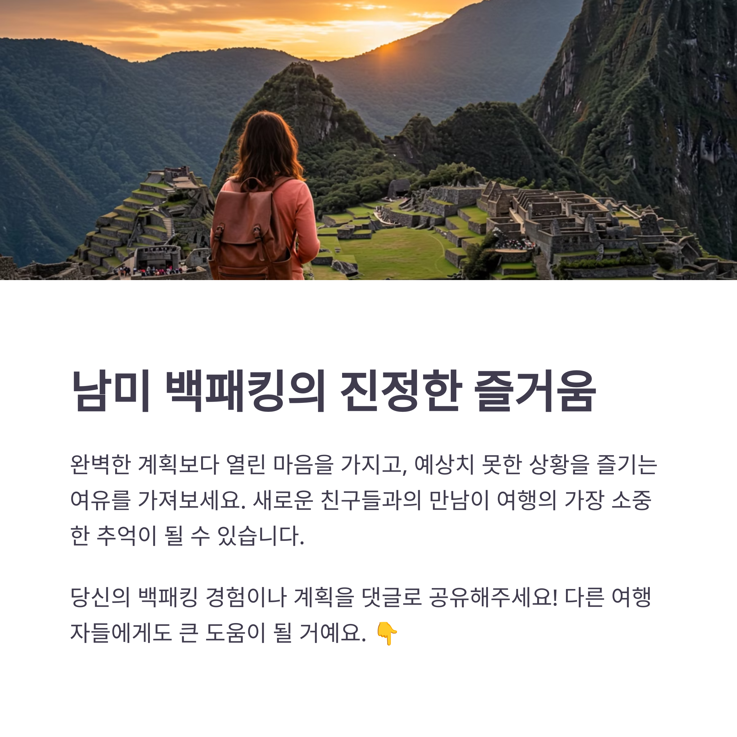남미에서의 백패킹은 단순한 여행을 넘어 인생을 바꾸는 경험이 될 수 있어요.