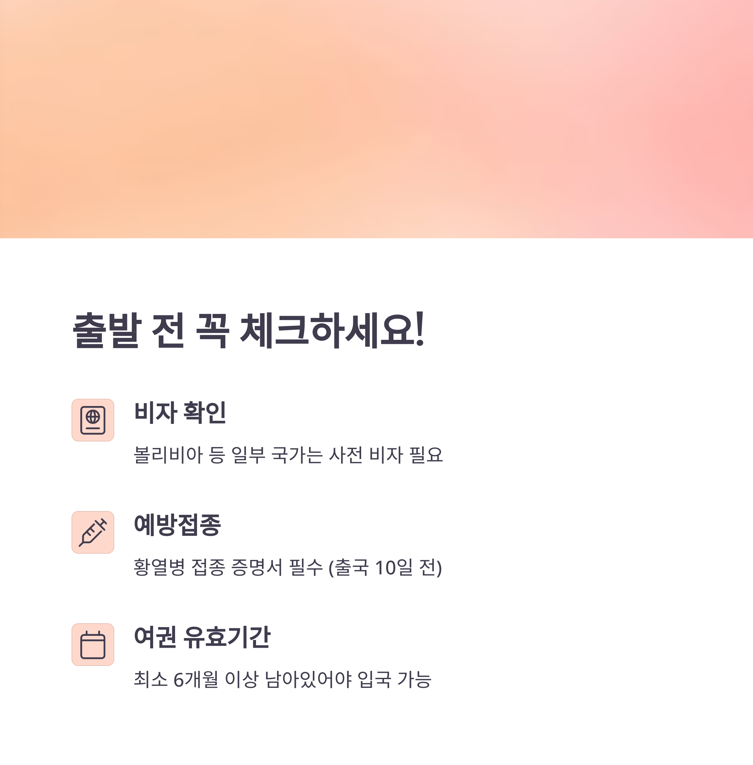 남미 백패킹을 시작하기 전에는 비자 요건을 꼭 확인하세요. 국가마다 다른 규정이 있으니 사전에 알아두는 것이 좋아요.