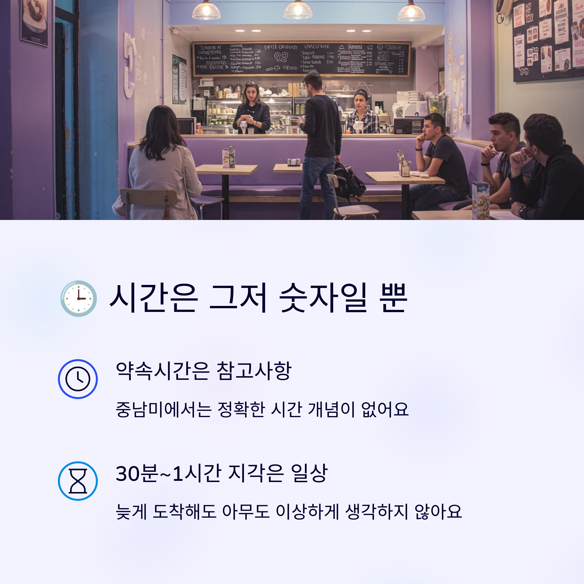 한국에서는 약속 시간에 늦으면 큰 실례라고 생각하죠? 하지만 남미에서는 약속 시간은 그저 참고사항일 뿐이에요. 😅