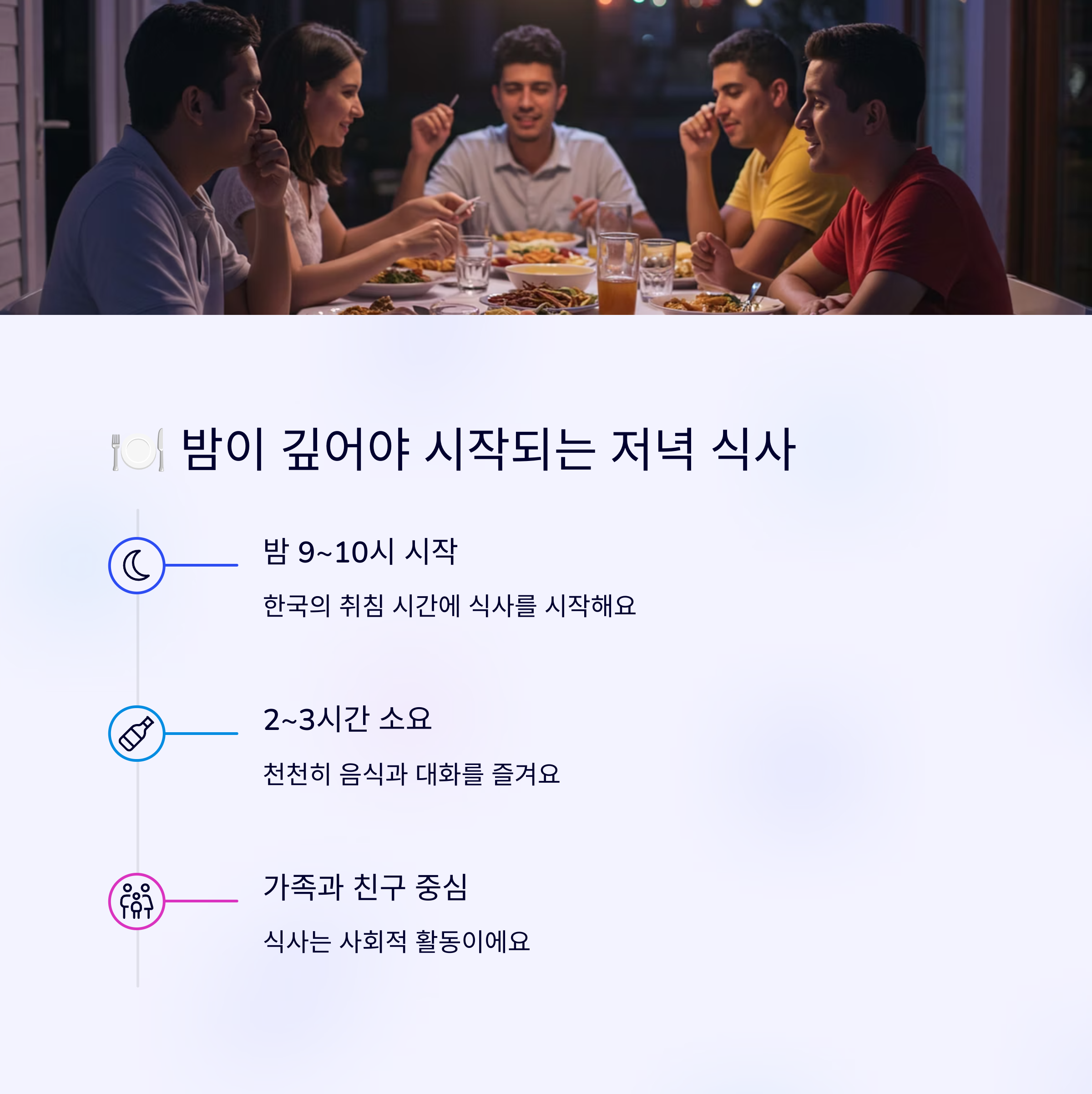 남미의 식사 시간은 우리나라와 완전히 달라요. 특히 아르헨티나나 칠레 같은 국가에서는 저녁 식사가 밤 9시나 10시에 시작되는 경우가 많답니다! 😮