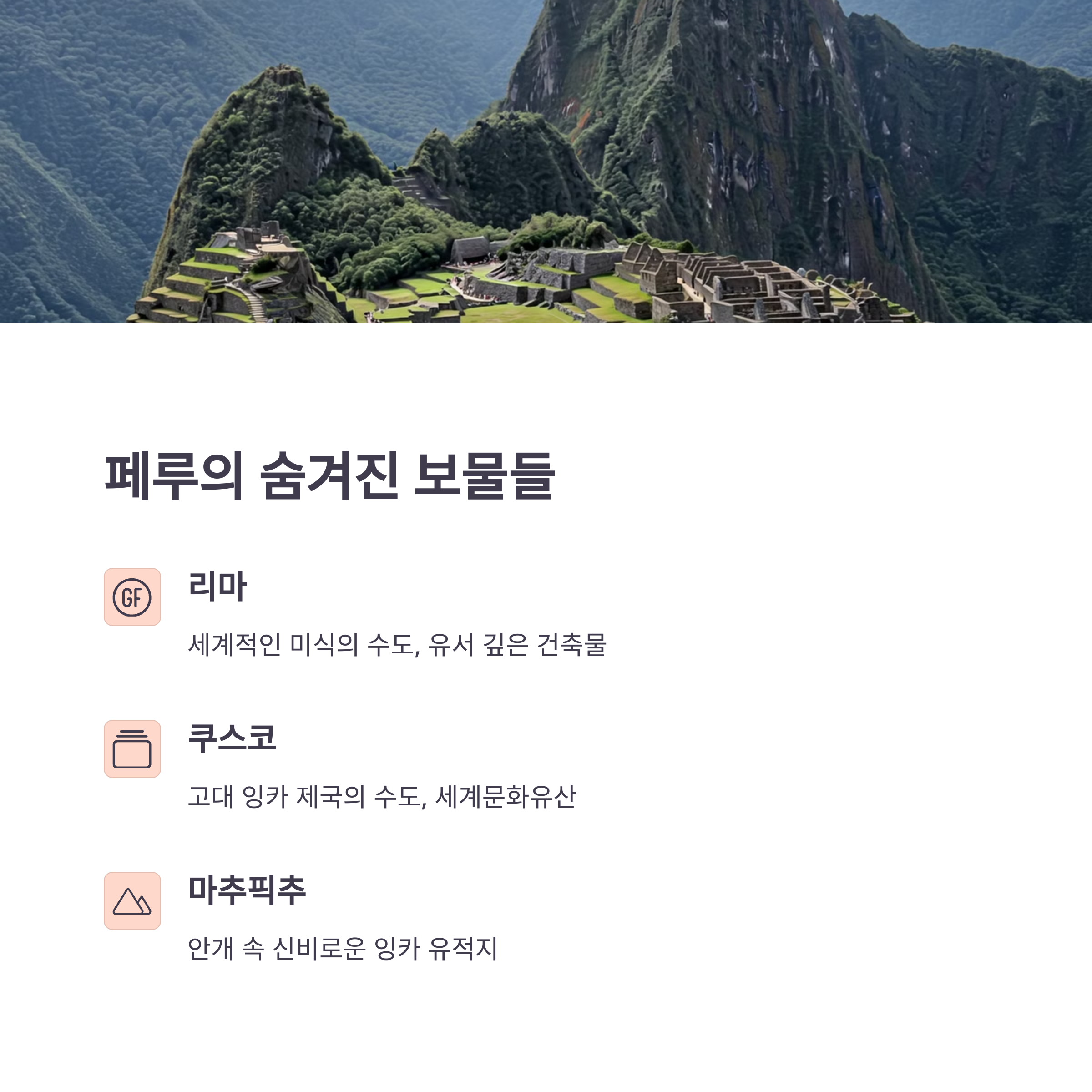 페루에서는 리마를 시작으로 쿠스코와 마추픽추로 이어지는 경로가 가장 인기 있습니다.