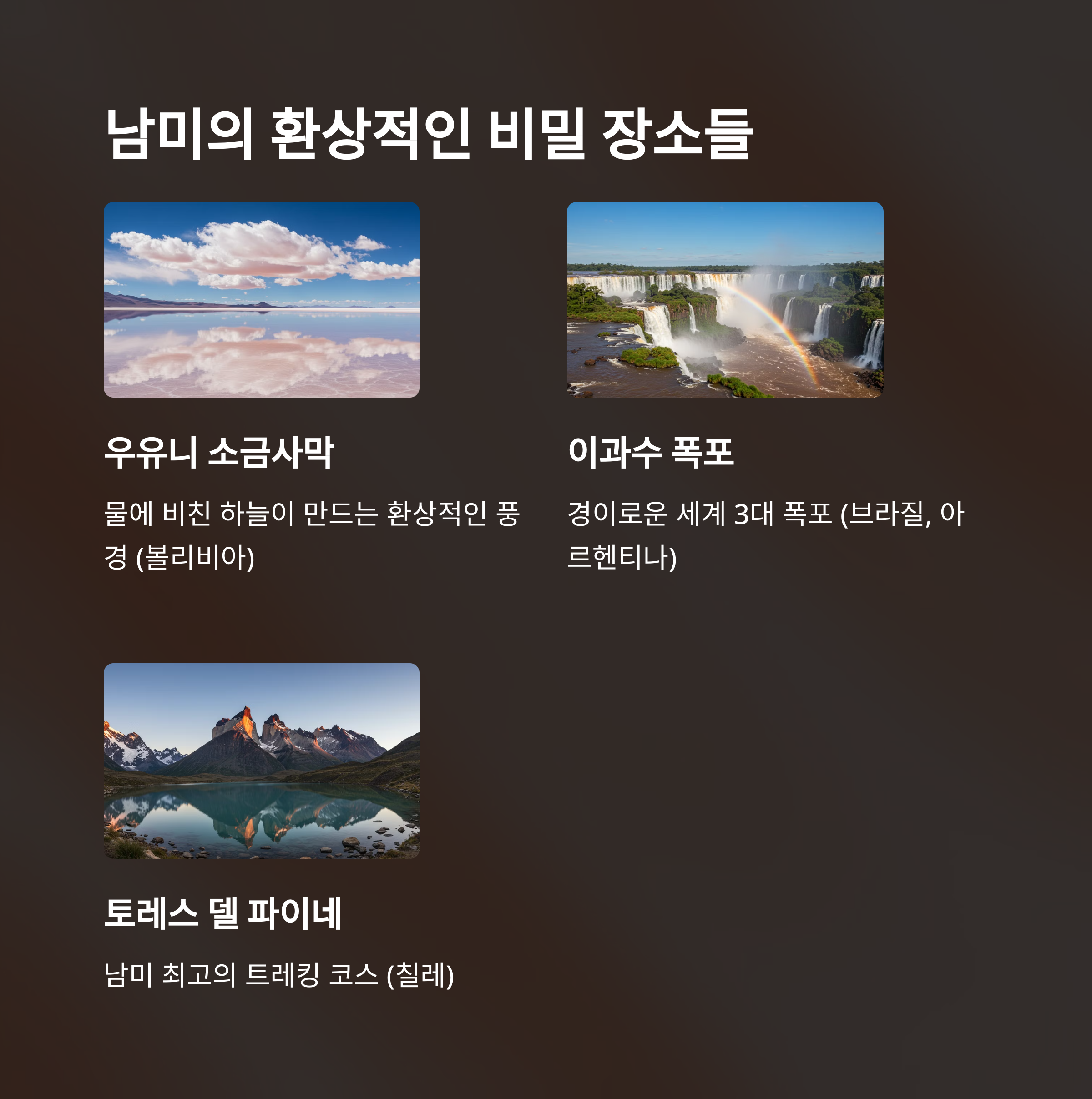 브라질의 활기찬 축제부터 페루의 신비로운 고대 유적까지, 남미는 여행자들에게 평생 잊지 못할 경험을 선사합니다.