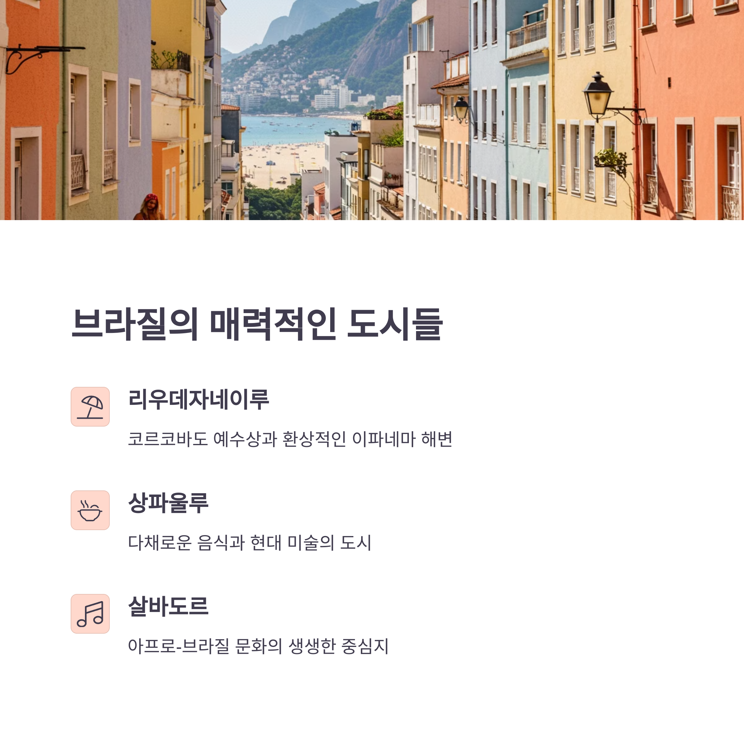 브라질은 남미에서 가장 큰 국가로, 다양한 지역과 문화를 경험할 수 있습니다.