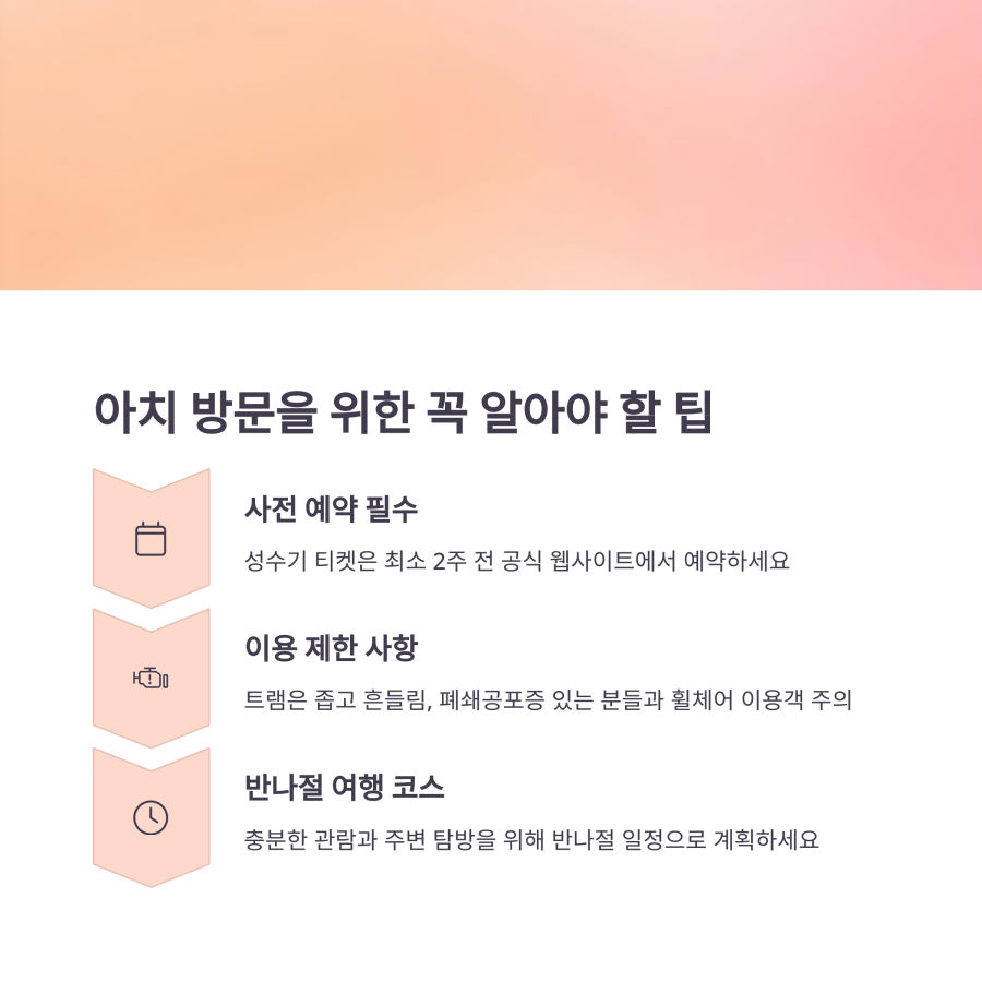 여름철에는 오전 일찍 방문하는 것도 좋은 선택입니다. 아치 내부는 에어컨이 잘 작동하지만, 외부 대기 공간은 상당히 더울 수 있으니 참고하세요.