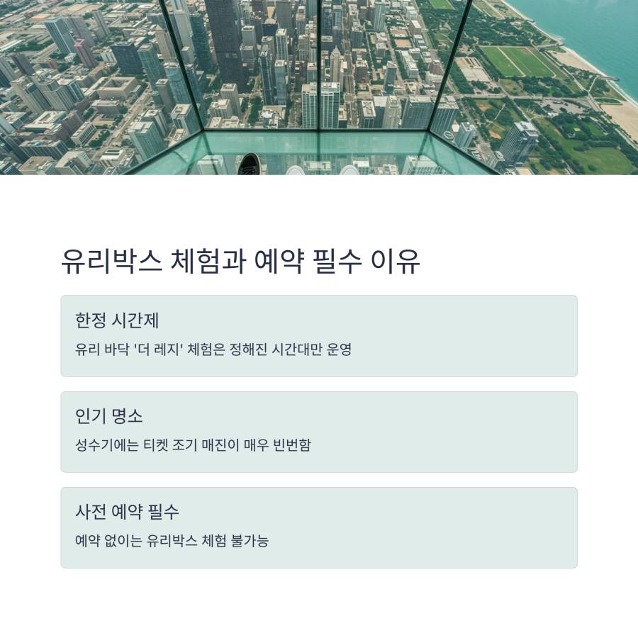 하지만 많은 분들이 모르시는 사실! 예약을 미리 하지 않으면 유리박스는 구경만 하고 올 수도 있어요. 그래서 오늘은 실패 없는 윌리스타워 방문을 위한 모든 정보를 알려드릴게요.
