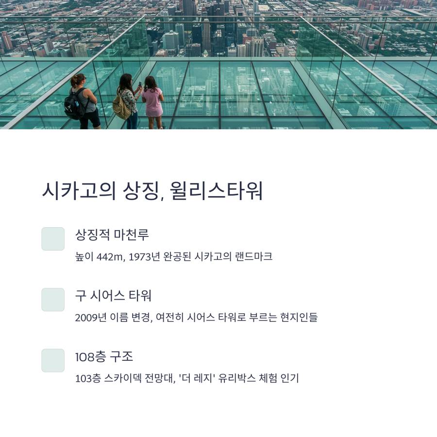 시카고 하면 빼놓을 수 없는 랜드마크, 바로 윌리스타워인데요. 특히 아찔한 유리박스 스카이덱(The Ledge)은 한 번쯤 도전해보고 싶은 버킷리스트죠!
