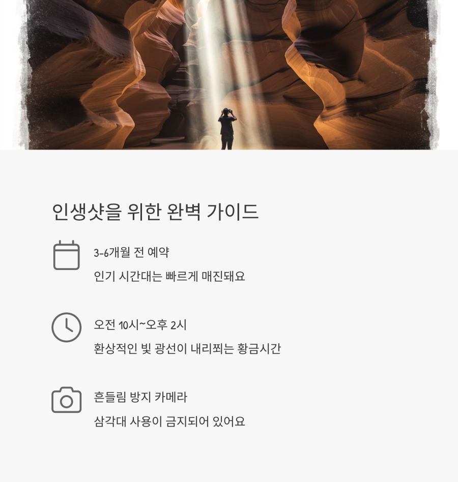 앤텔로프캐니언 투어는 최소 3~6개월 전에 예약하는 것이 좋아요. 특히 여름 성수기(5월~9월)는 빛의 광선을 볼 수 있는 시간대가 인기 만점이라 더 빨리 예약이 필요해요.