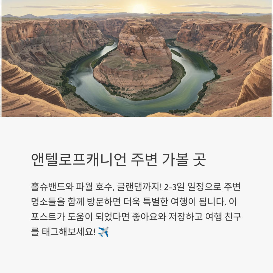 앤텔로프캐니언 주변에는 호스슈 밴드(Horseshoe Bend)나 파웰 호수(Lake Powell) 같은 명소들도 있어요. 하루 일정으로 함께 방문하면 더 알찬 여행이 될 수 있어요.