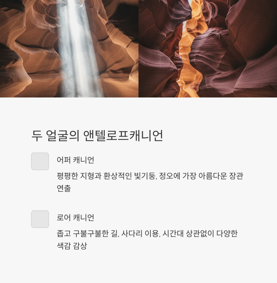 투어는 크게 어퍼 캐니언(Upper Canyon)과 로어 캐니언(Lower Canyon) 두 가지로 나뉘어요. 각각의 특징이 다르니 여행 목적에 맞게 선택하는 것이 중요해요.