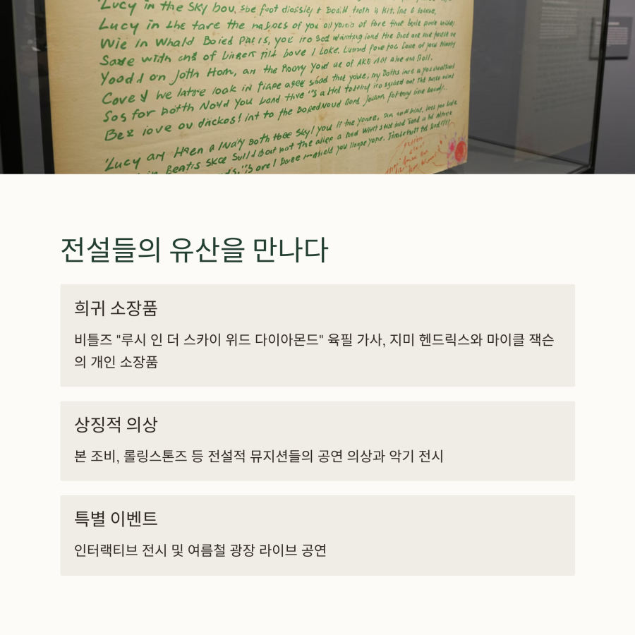 존 레논의 기타와 폴 매카트니의 필기 노트 등 귀중한 유물들이 전시되어 있어요.