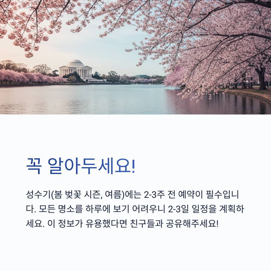 이 글에서는 워싱턴 D.C. 여행 계획 시 꼭 알아두셔야 할 예약 방법과 주의사항을 자세히 알려드릴게요. 미리 준비하시면 여행이 훨씬 수월해질 거예요! 🌟