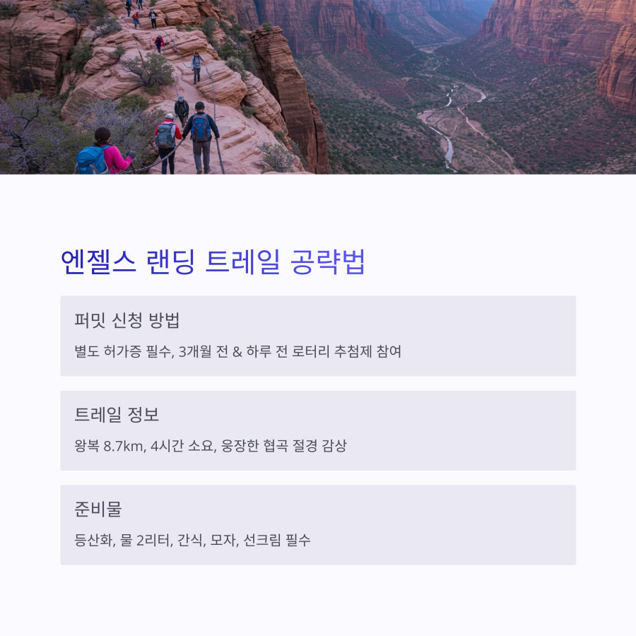 자이언 캐니언의 모든 트레일이 예약이 필요한 것은 아니지만, 인기 있는 에인절스 랜딩(Angels Landing)은 별도의 허가증(permit)이 필요해요. 이 트레일은 높은 인기로 인해 추첨 시스템을 통해 허가증을 발급하고 있어요.