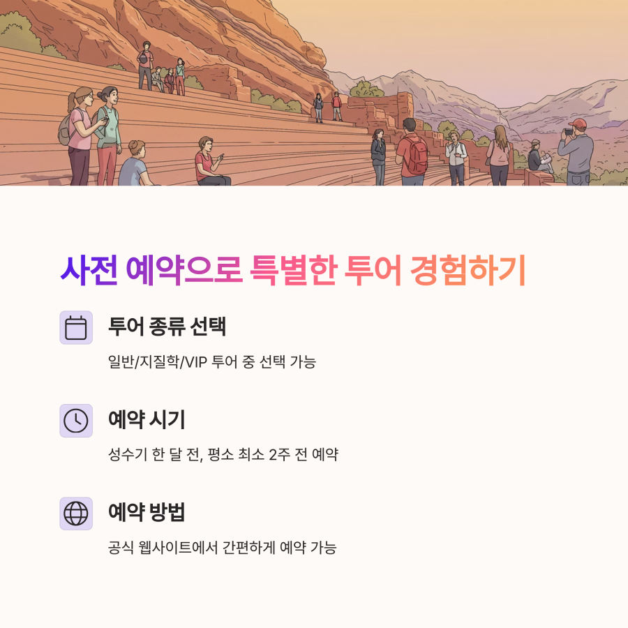일반 투어, 지질학 투어, VIP 투어 등 다양한 옵션이 있으니 자신에게 맞는 투어를 선택하세요.