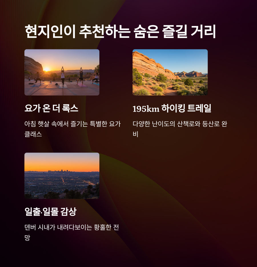 | 우천시 공연 | 하이킹 코스 | 덴버 시내까지 거리 |