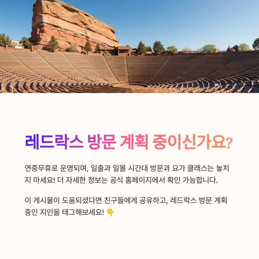 안녕하세요! 오늘은 음악과 자연의 조화가 완벽하게 이루어진 세계적인 공연장, 콜로라도 덴버의 레드락스 공연장에 대한 정보를 나누려고 해요.