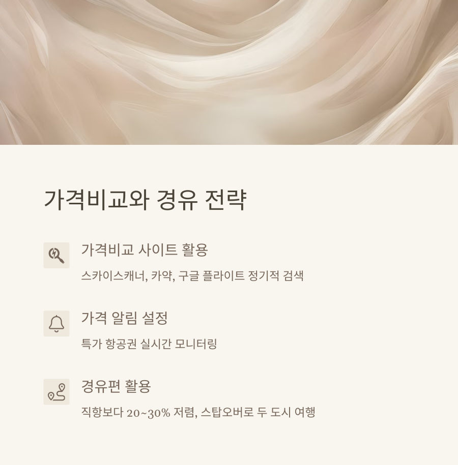 | 경유 항공편은 어떤 장단점이 있나요? | 경유 항공편의 가장 큰 장점은 직항보다 저렴한 가격입니다. 때로는 30~40% 정도 절약할 수 있어요. 단점은 전체 여행 시간이 길어지고, 환승 과정에서 불편함이 있을 수 있다는 점입니다. 경유 시간이 너무 짧으면 연결편을 놓칠 위험이 있으니 최소 2시간 이상은 확보하는 것이 좋습니다. |