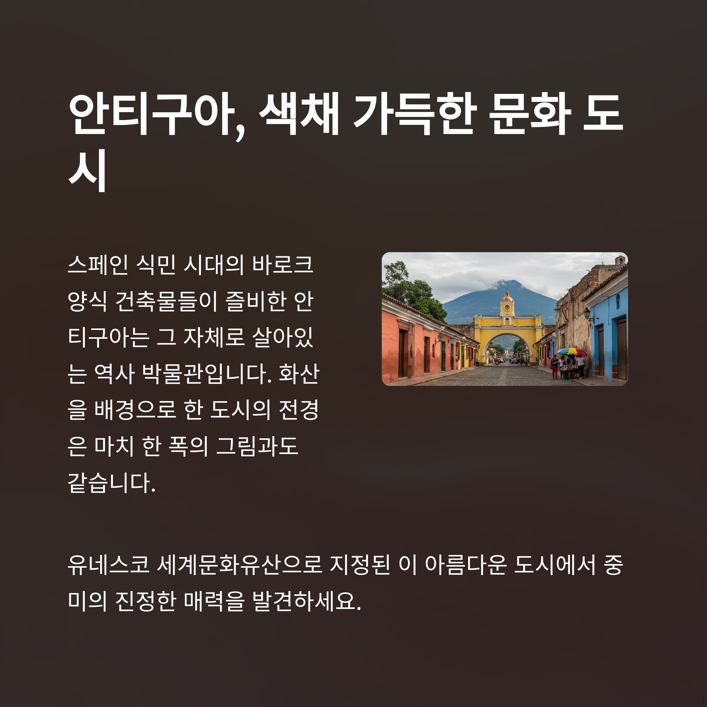 구시가지의 아름다움을 간직한 안티구아(Antigua)는 화려한 색감의 건물들과 문화적 다양성으로 여행자들의 사랑을 받는 도시입니다.