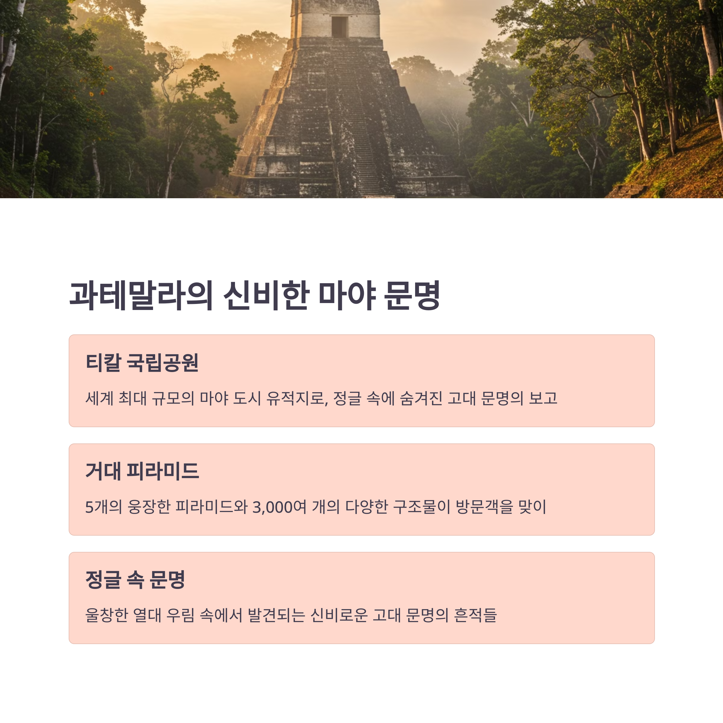 과테말라로 넘어가면 티칼 국립공원(Tikal National Park)이 여러분을 기다리고 있어요. 울창한 정글 속에 숨겨진 이 마야 유적지는 유네스코 세계문화유산으로 등재되어 있답니다.