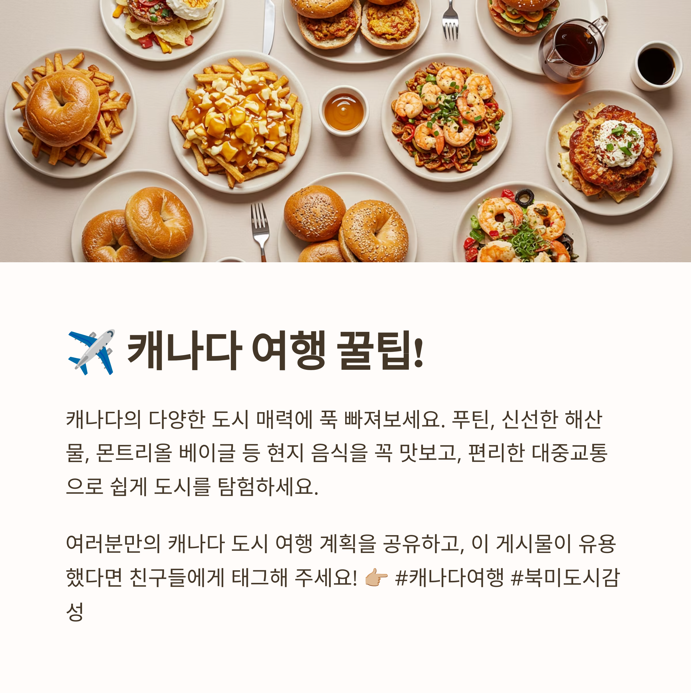 토론토에서는 세인트 로렌스 마켓에서 다양한 음식을 맛볼 수 있고, 몬트리올에서는 꼭 '푸틴'과 '베이글'을 드셔보세요! 밴쿠버는 신선한 해산물이 일품이에요. 🥣