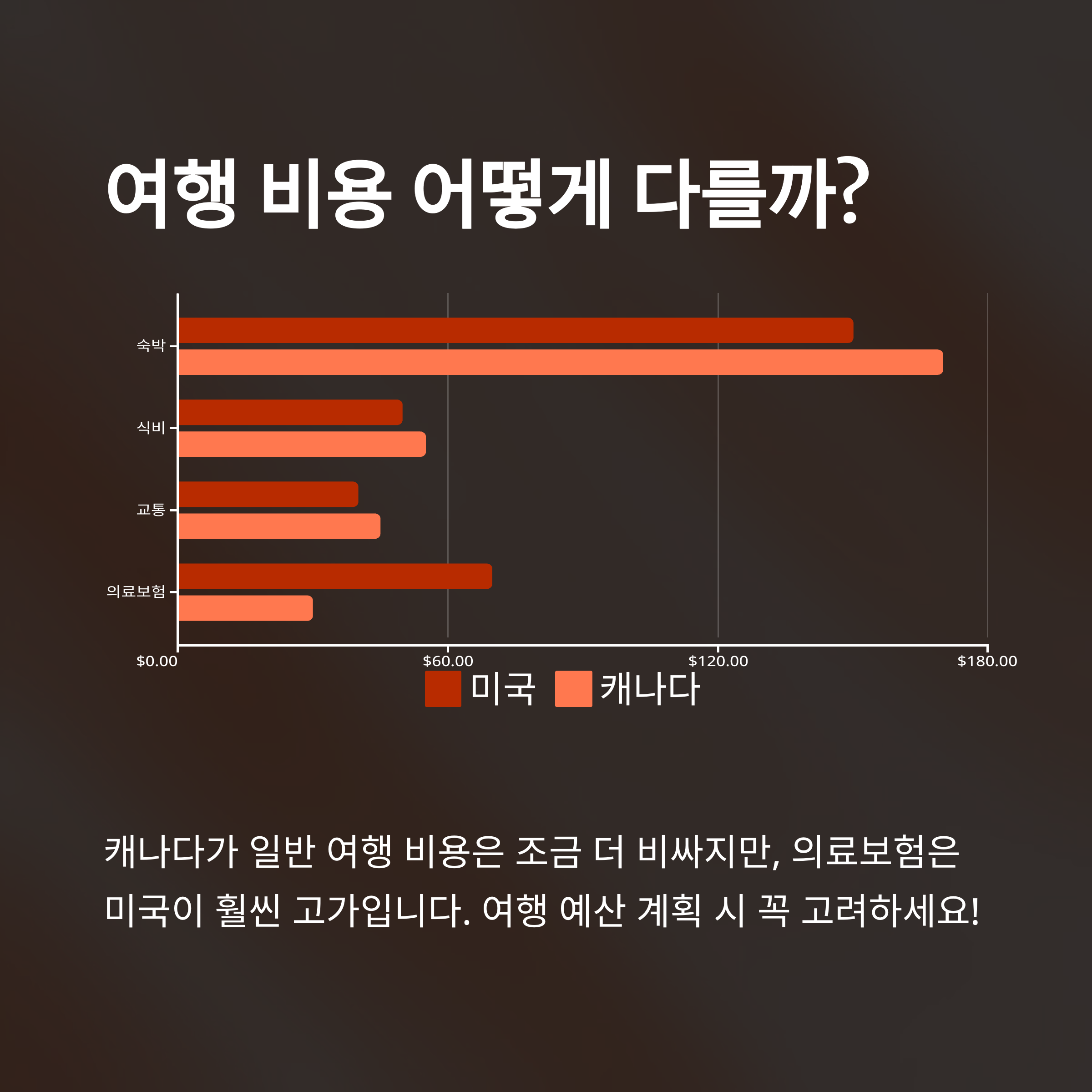 숙박비는 두 나라 모두 대도시가 비싸지만, 미국은 다양한 가격대의 선택지가 있어요. 식비는 캐나다의 세금과 팁이 더 높은 경향이 있습니다.