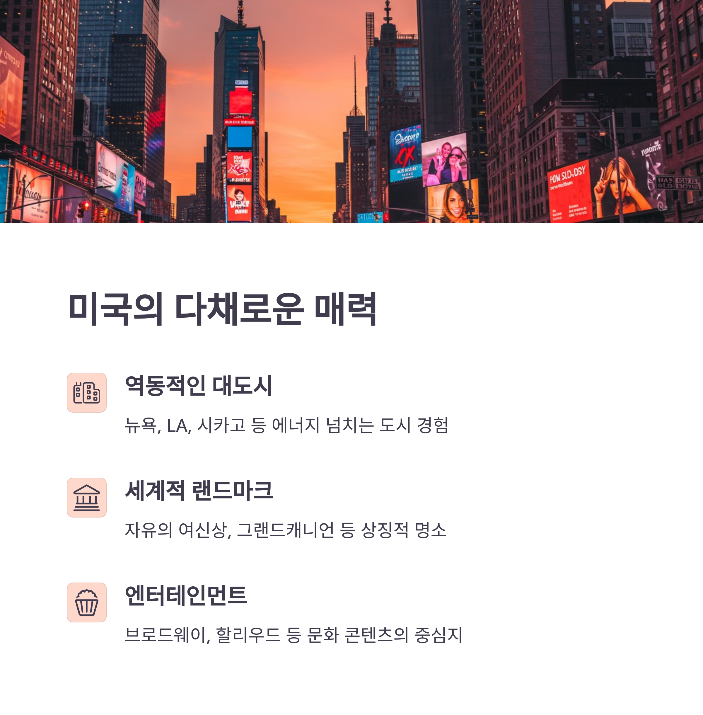 미국의 뉴욕, LA, 시카고 같은 대도시들은 세계적인 랜드마크, 박물관, 쇼핑 명소가 즐비합니다. 특히 브로드웨이 공연이나 할리우드 문화는 미국만의 특별한 경험이죠.