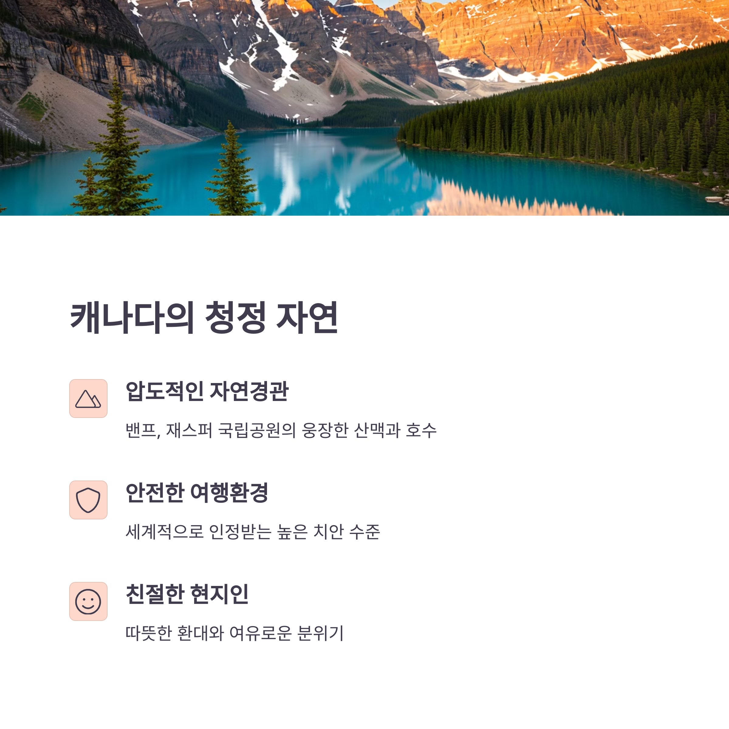 반면 캐나다는 밴프, 재스퍼, 요호 국립공원 등 로키산맥의 절경과 나이아가라 폭포의 웅장함을 경험할 수 있습니다.