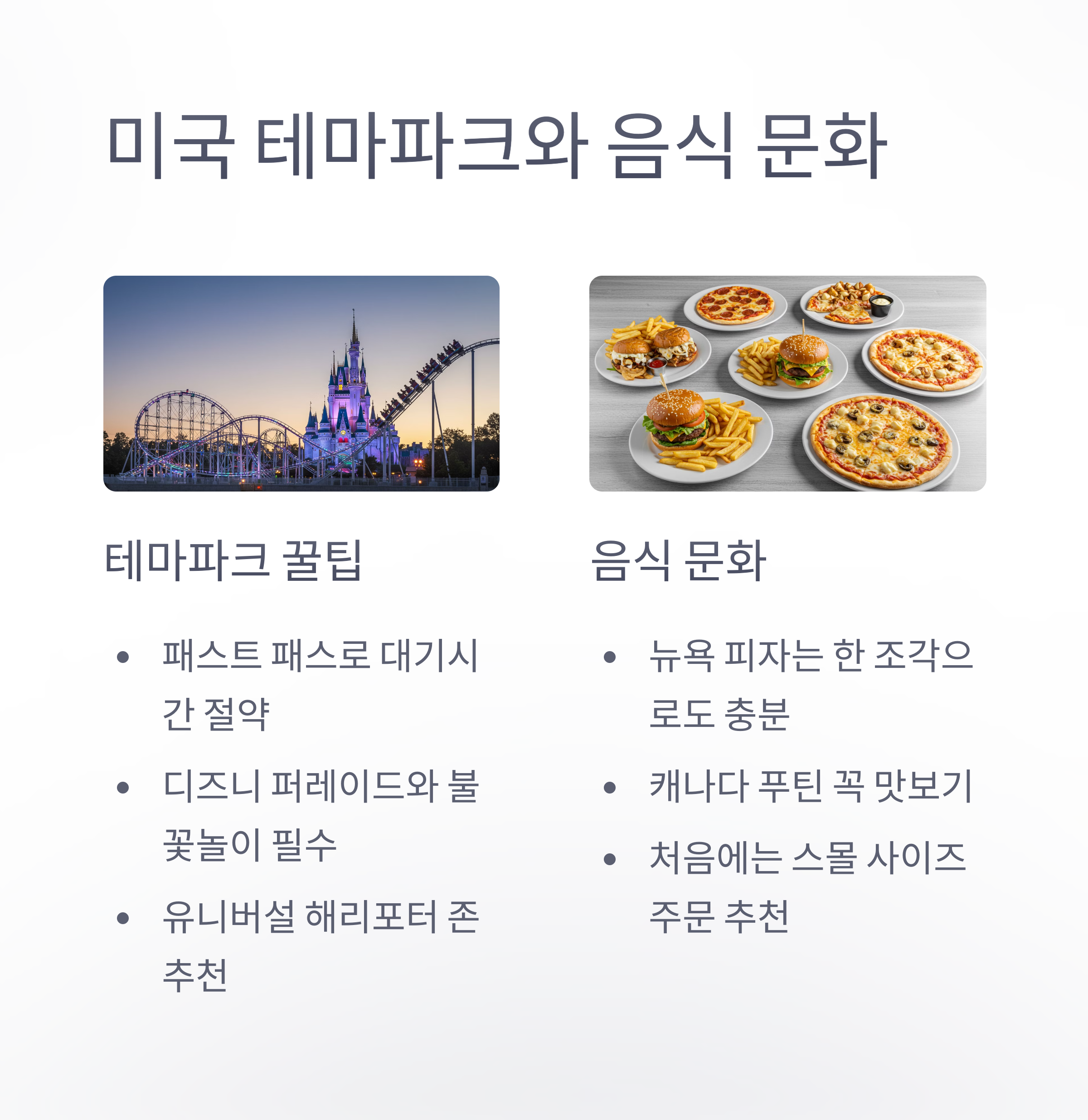 미국 여행에서 빼놓을 수 없는 것이 바로 테마파크예요! 디즈니랜드와 유니버설 스튜디오는 아이들뿐만 아니라 어른들에게도 즐거운 경험이 될 거예요.
