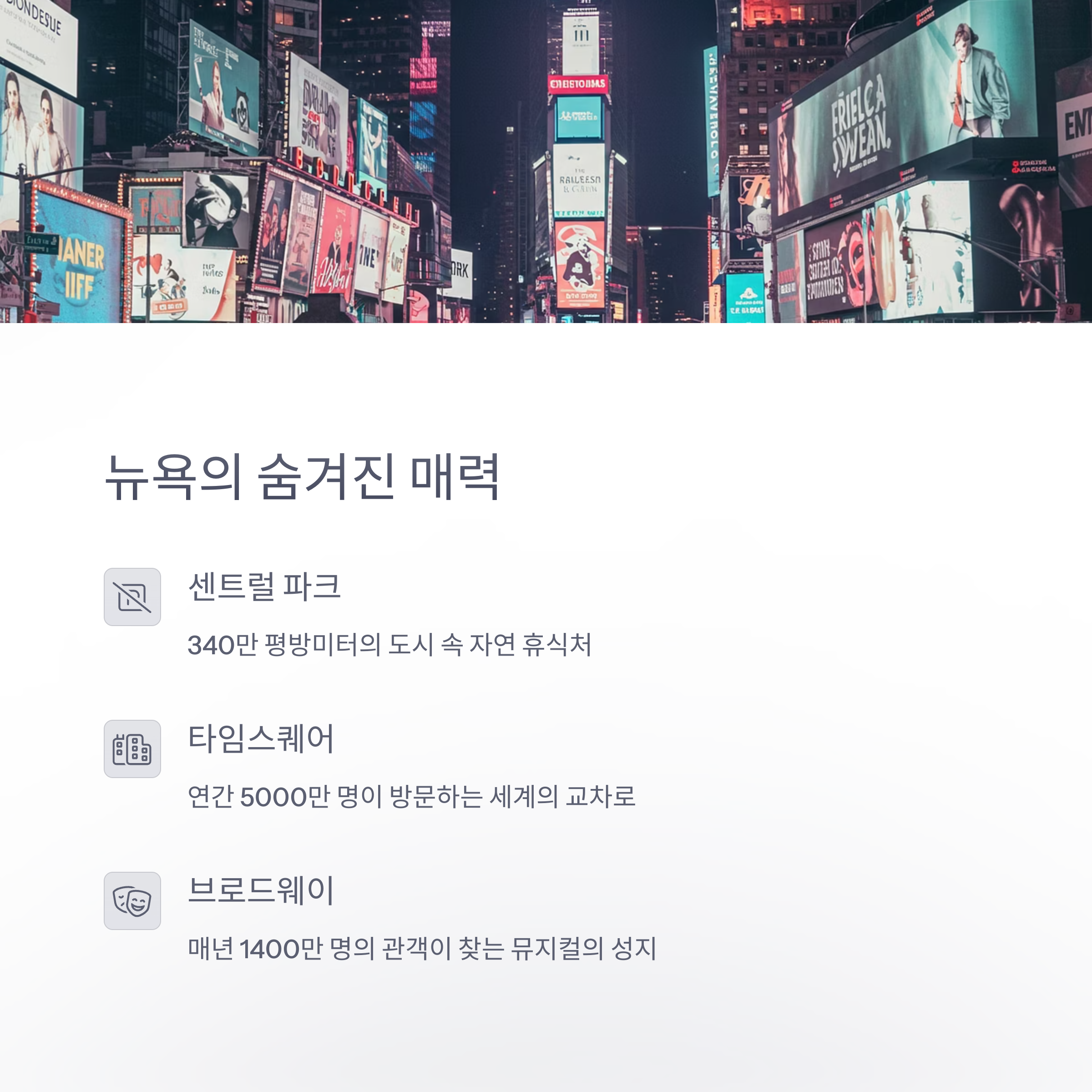 특히 타임스퀘어의 화려한 불빛은 밤에 꼭 한번 경험해보세요! 브로드웨이 뮤지컬도 미리 예약하면 좋은 자리에서 관람할 수 있어요. 😊