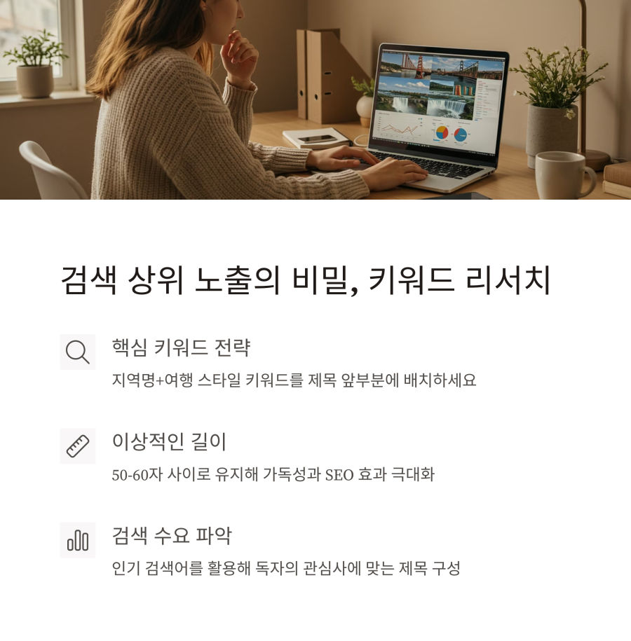 먼저 키워드 리서치를 통해 많이 검색되는 단어를 찾아보세요. 예를 들어 "미국 여행"보다는 "미국 서부 여행 코스"처럼 구체적인 키워드가 경쟁이 덜하고 타겟층이 명확해요. 🎯