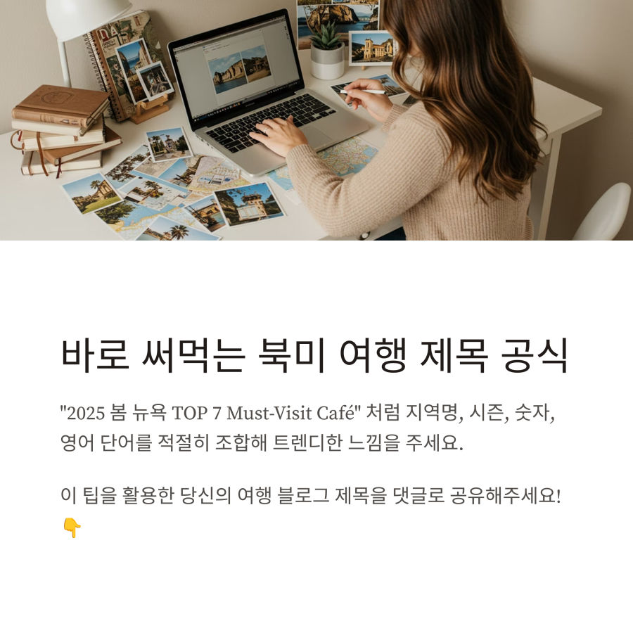 단순히 "미국 여행 후기"라고 쓰는 것보다 "뉴욕 3박4일, 현지인만 아는 숨은 맛집 BEST5"처럼 구체적이고 호기심을 자극하는 제목이 훨씬 효과적이에요! 🌟