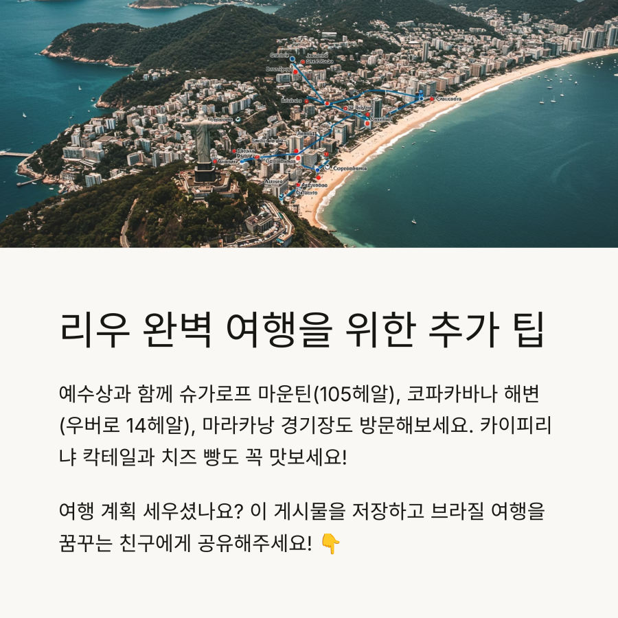 또한 코파카바나와 이파네마 해변은 리우에서 꼭 방문해야 할 곳이죠. 브라질 사람들의 일상을 경험할 수 있는 곳입니다. 🏖️