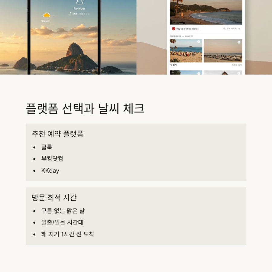 예약 시 날씨 체크도 필수입니다. 구름이 많거나 비 오는 날에는 예수상이 구름에 가려 보이지 않는 경우가 많아요. 날씨 앱에서 '구름 양'까지 확인하세요.
