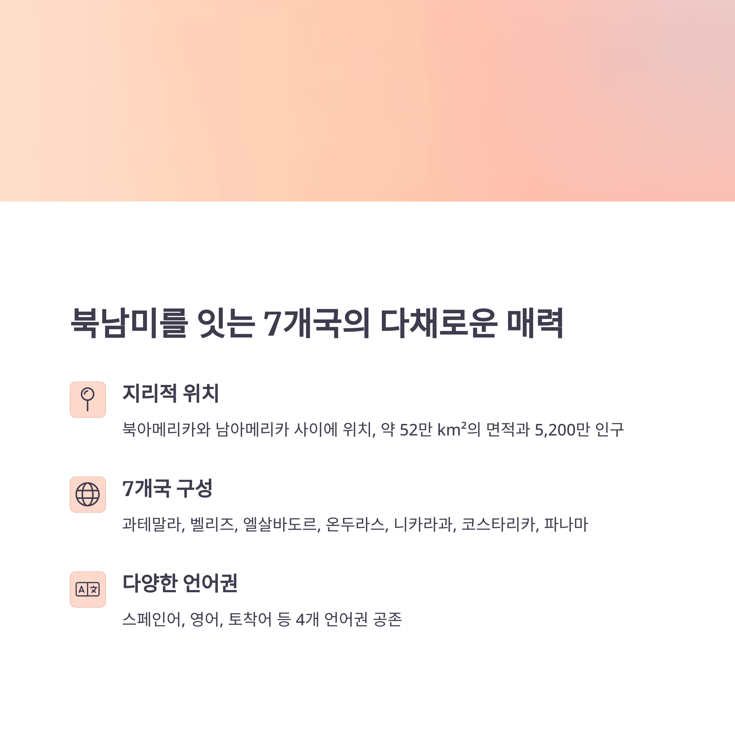 중앙아메리카는 북아메리카와 남아메리카 사이에 위치한 7개국(과테말라, 벨리즈, 엘살바도르, 온두라스, 니카라과, 코스타리카, 파나마)으로 이루어진 지역이에요.