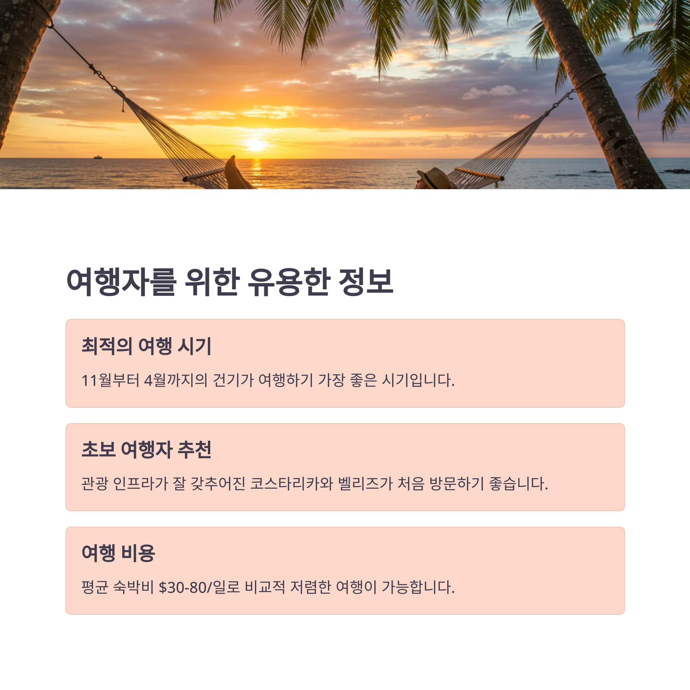 | 초보 여행자에게 추천하는 중앙아메리카 국가는? | 코스타리카와 벨리즈는 관광 인프라가 잘 발달되어 있고 영어 사용률이 높아 초보 여행자에게 좋아요. 안전하고 다양한 액티비티도 즐길 수 있답니다! |