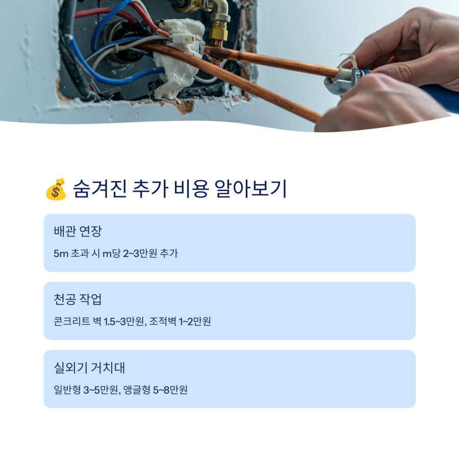 드레인 호스 연장, 실외기 거치대 설치, 케이블 전선관 등도 추가 비용 요소입니다. 이런 부분들을 미리 체크해두면 좋아요! 🔍