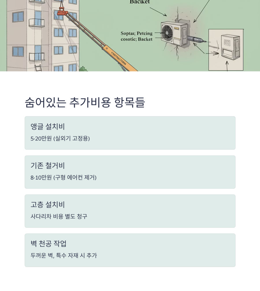 **벽 천공**이 어려운 경우(철근 콘크리트 등) 5-10만원 추가 비용이 발생해요.