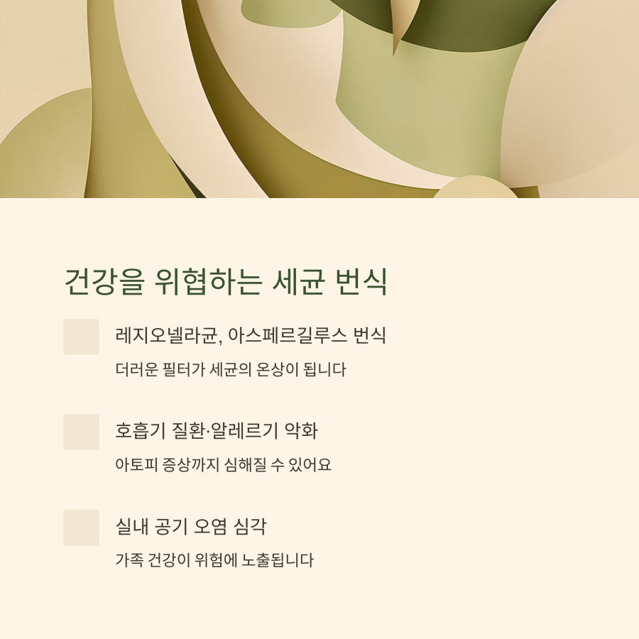 에어컨 청소를 소홀히 하면 **레지오넬라균**이나 **아스페르길루스** 같은 위험한 세균이 번식할 수 있어요.이런 세균들은 호흡기를 통해 우리 몸에 들어와 심각한 질병을 일으킬 수 있답니다.