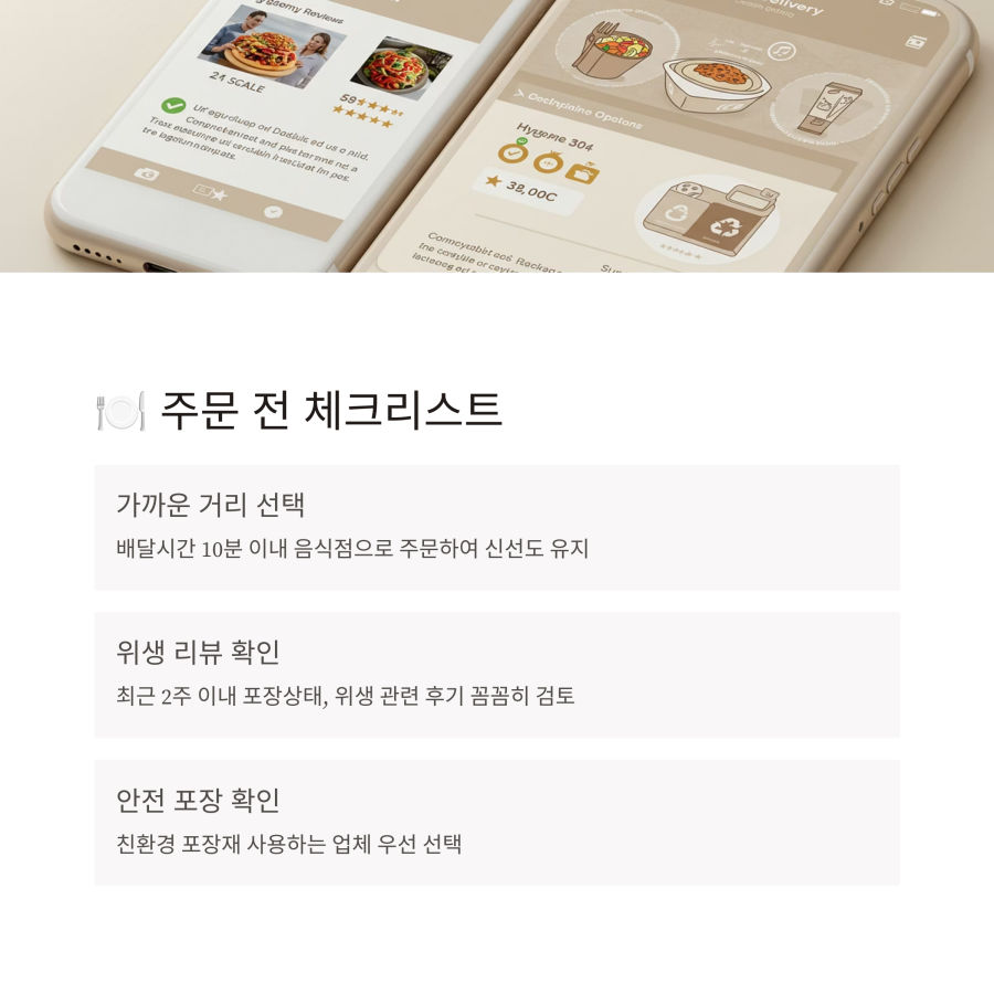 | 주문 전 리뷰 확인 | 가까운 거리 음식점 | 포장 상태 점검 |