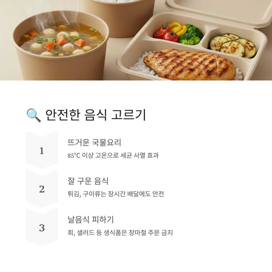 | 뜨거운 국물 요리(찌개, 탕 등), 구운 음식(치킨, 피자 등), 그리고 튀김 음식이 비교적 안전해요. 이런 음식들은 조리 과정에서 고온 처리되어 세균이 적고, 배달 후 재가열하기도 쉽습니다. |