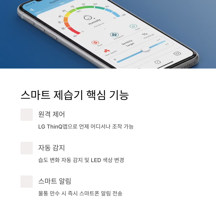 | 스마트 제습기는 원격 제어, 자동 습도 감지, AI 학습 기능, 다른 스마트홈 기기와의 연동 등이 가능하다는 점이 가장 큰 차이예요. 일반 제습기보다 초기 비용은 높지만 편의성과 에너지 효율성이 뛰어납니다. |