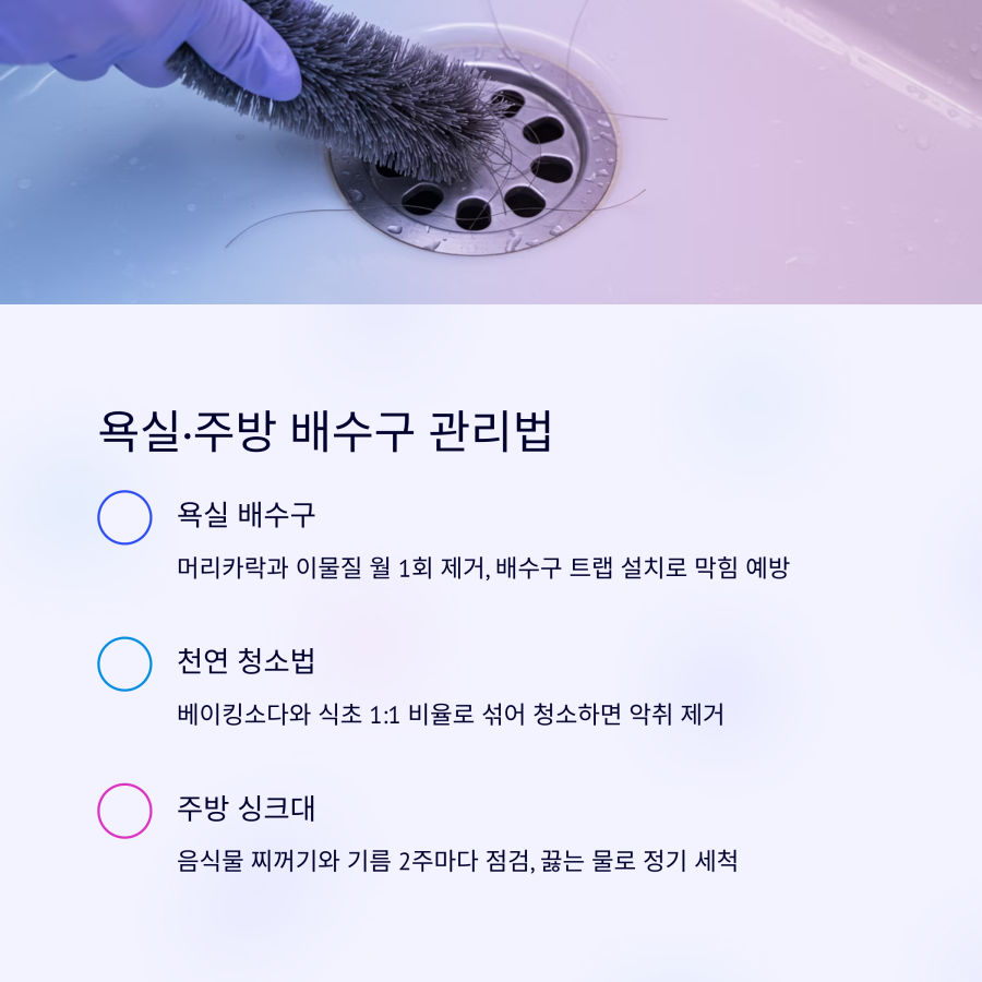 A: 욕실은 월 1회, 주방은 2주에 1회, 베란다는 계절이 바뀔 때마다 점검하는 것이 좋아요. 특히 장마철 전에는 모든 배수구를 꼼꼼히 점검해주세요.