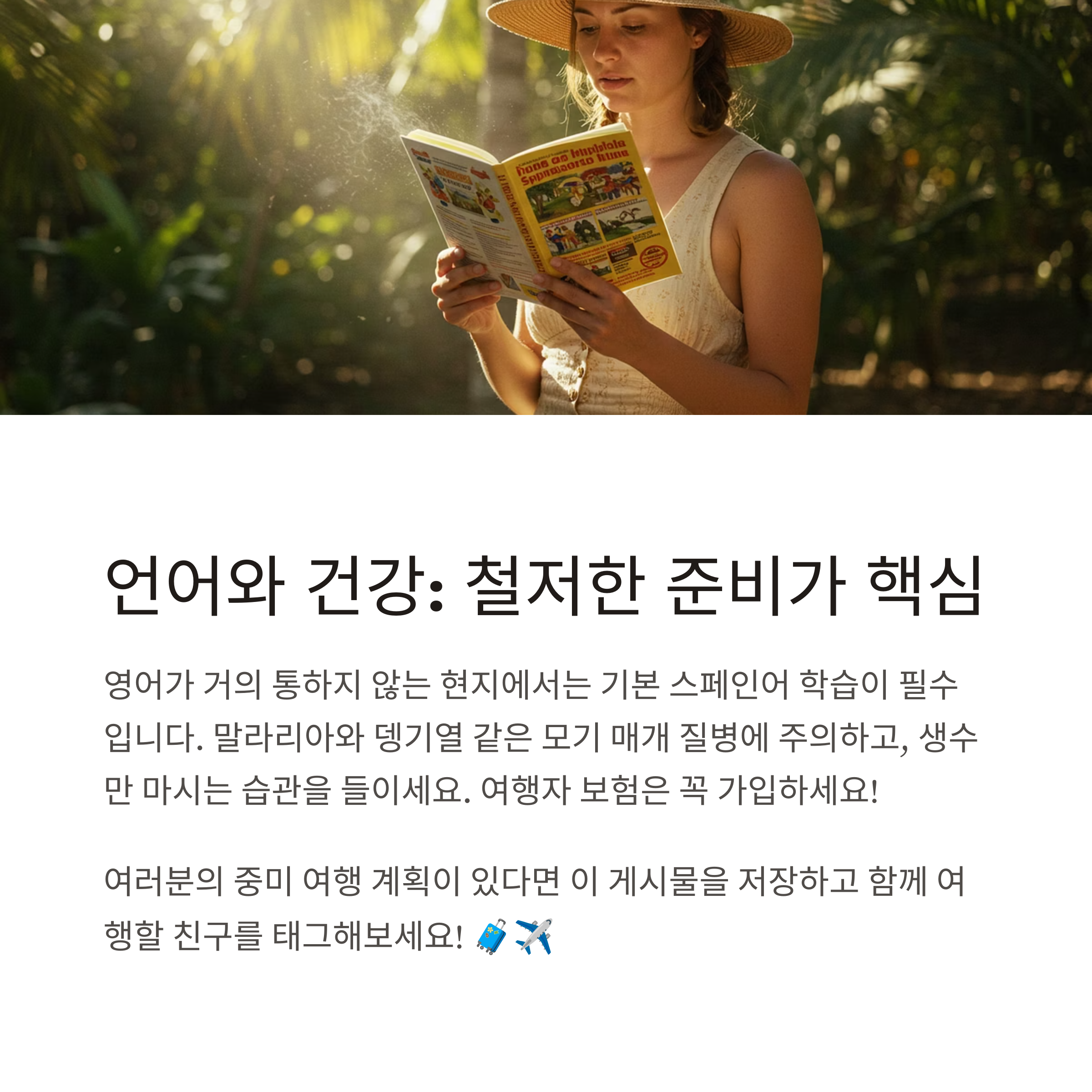 중미 여행에서 건강 문제는 미리 대비하는 것이 중요해요. 말라리아, 뎅기열 같은 모기 매개 질병이 있는 지역이 있으니 벌레 퇴치제는 필수입니다.