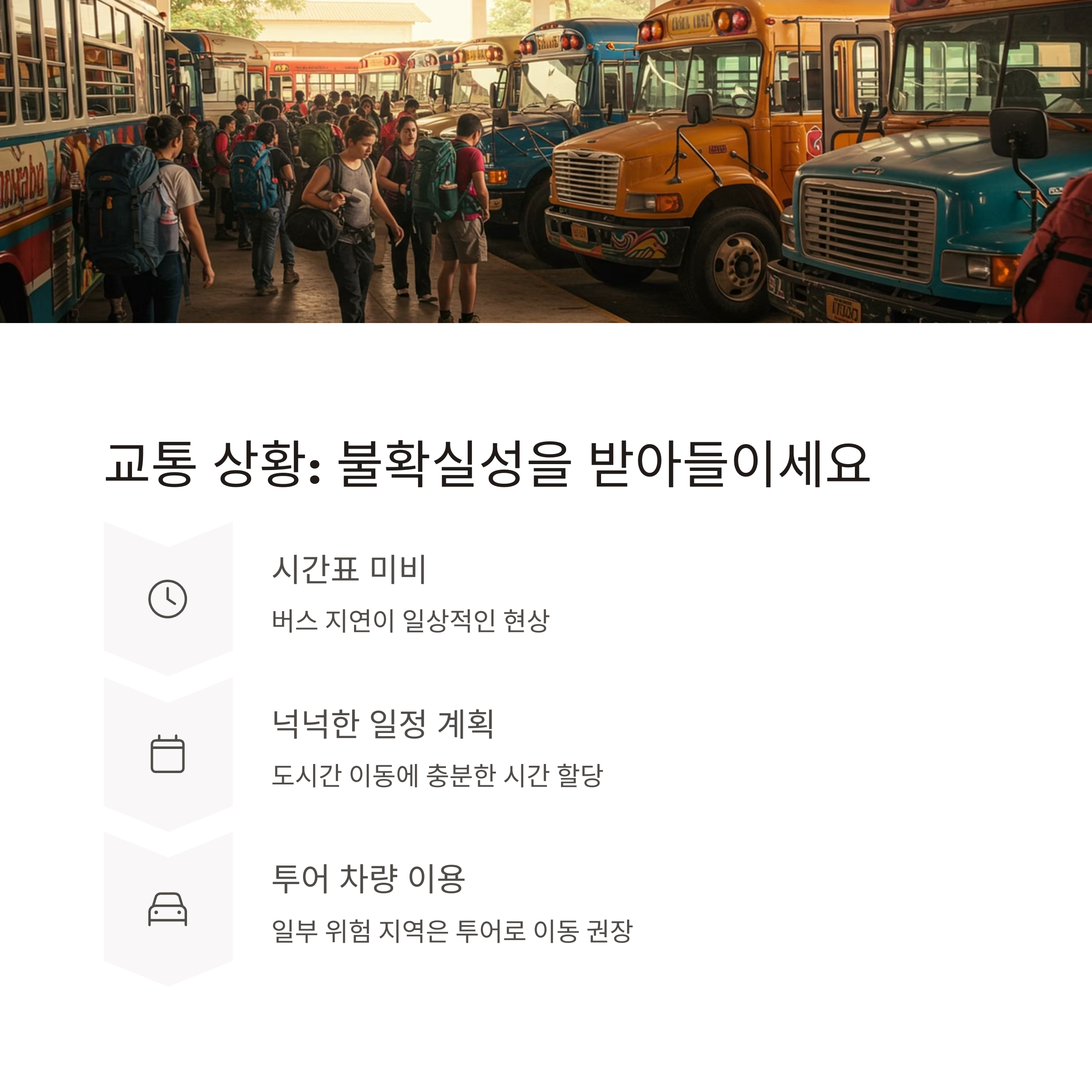 중미에서 가장 당황스러웠던 건 교통의 불확실성이었어요. 버스 시간표가 있어도 그대로 지켜지는 경우가 거의 없고, 갑자기 취소되거나 몇 시간씩 지연되는 일이 비일비재해요.