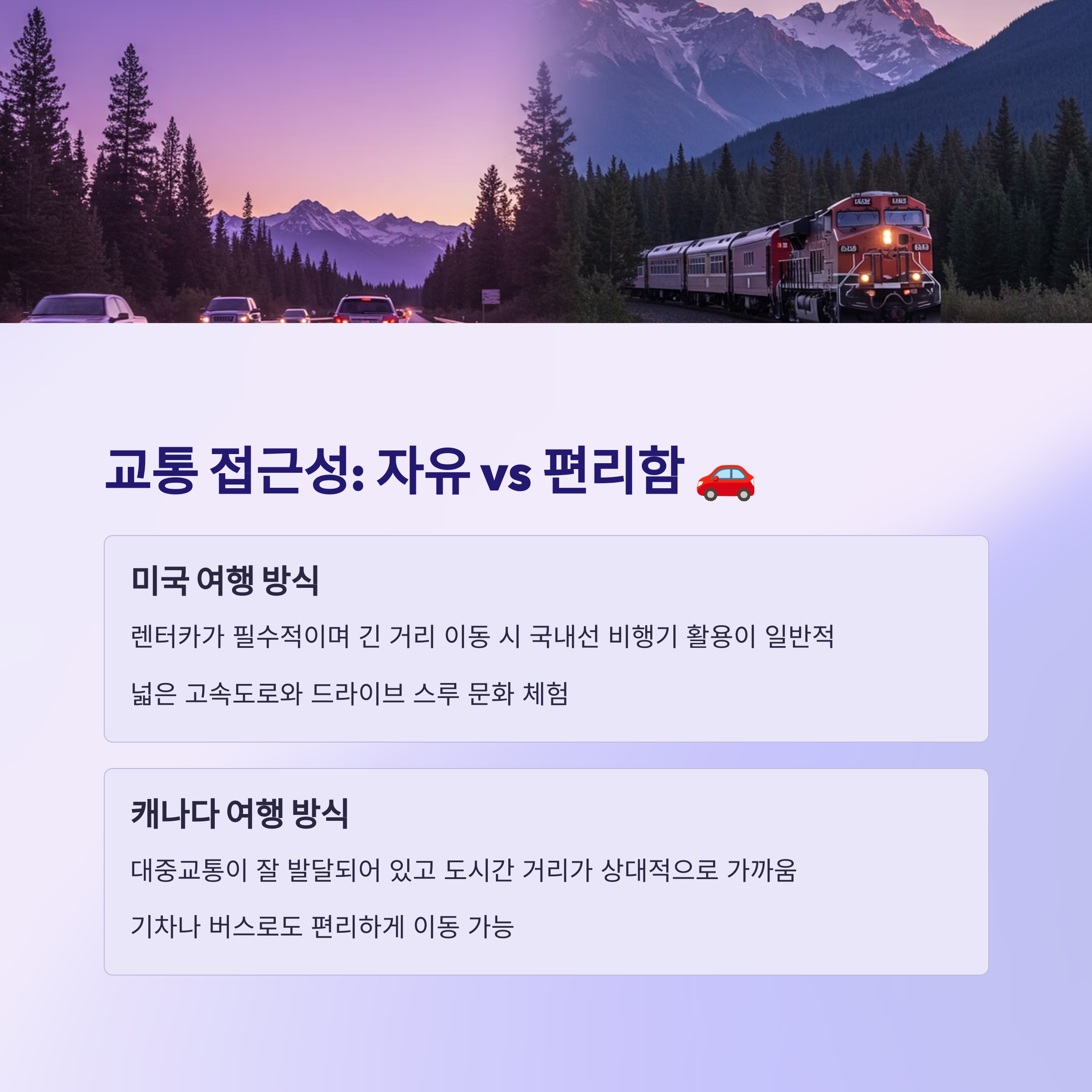 교통 측면에서는 미국은 렌터카가 거의 필수적인 반면, 캐나다는 대도시의 경우 대중교통만으로도 충분히 여행 가능해요.