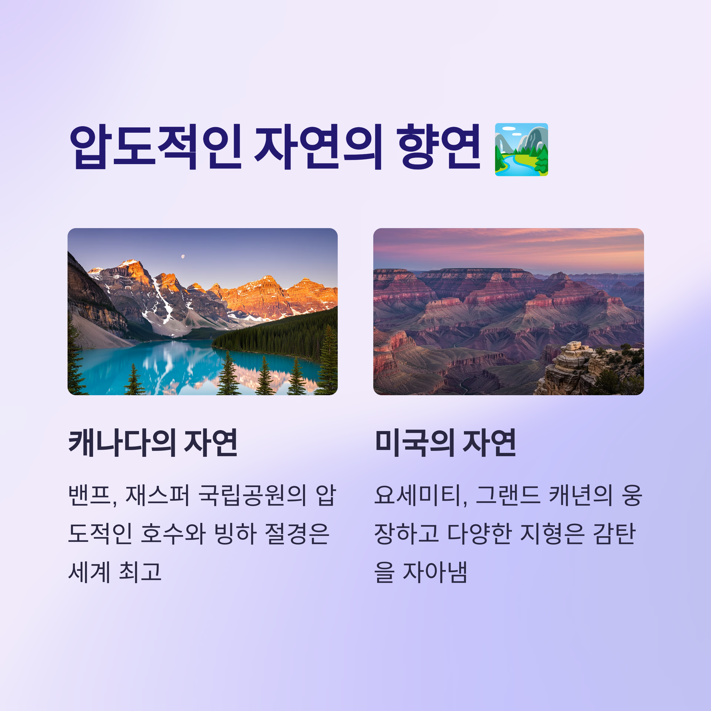 북미 두 강국, 과연 여행자 입장에서는 어떤 나라가 더 매력적일까요? 함께 알아봐요.