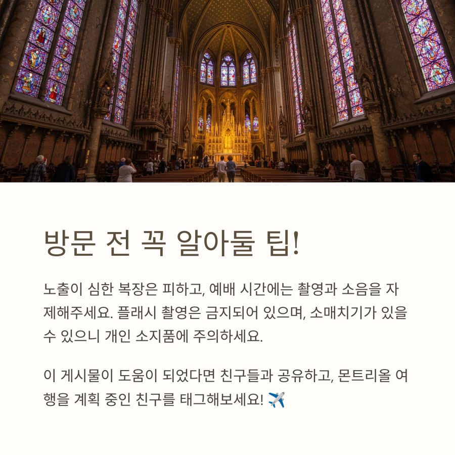 몬트리올을 방문한다면 절대 놓치면 안 되는 이 아름다운 성당, 하지만 많은 여행자들이 모르는 중요한 점이 있어요. 바로 사전 예약 없이는 입장이 불가능하다는 것입니다!