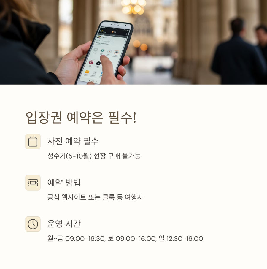 특히 성수기(5월~10월)에는 예약 없이 현장에서 티켓을 구하는 것은 거의 불가능해요. 저도 첫 방문 때 이 사실을 몰라 발을 동동 굴렀던 기억이 나네요.