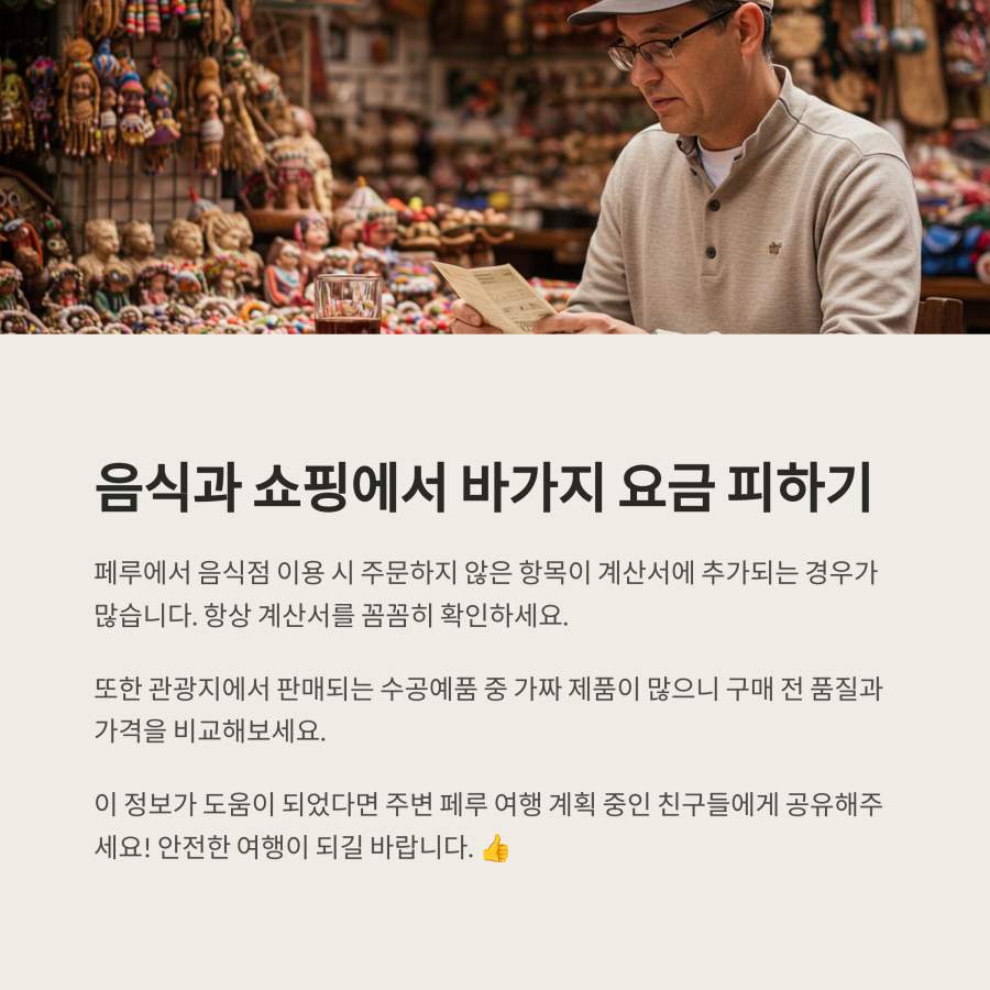 페루는 맛있는 음식으로 유명하지만, 일부 식당에서는 메뉴에 없는 항목을 몰래 추가하거나 바가지 요금을 청구하는 경우가 있어요. 계산서를 꼼꼼히 확인하는 습관이 필요해요. 🧾