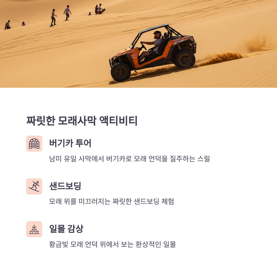 특히 버기를 타고 모래 언덕을 질주하는 경험은 다른 어디에서도 느낄 수 없는 짜릿함을 선사해요! 🏎️